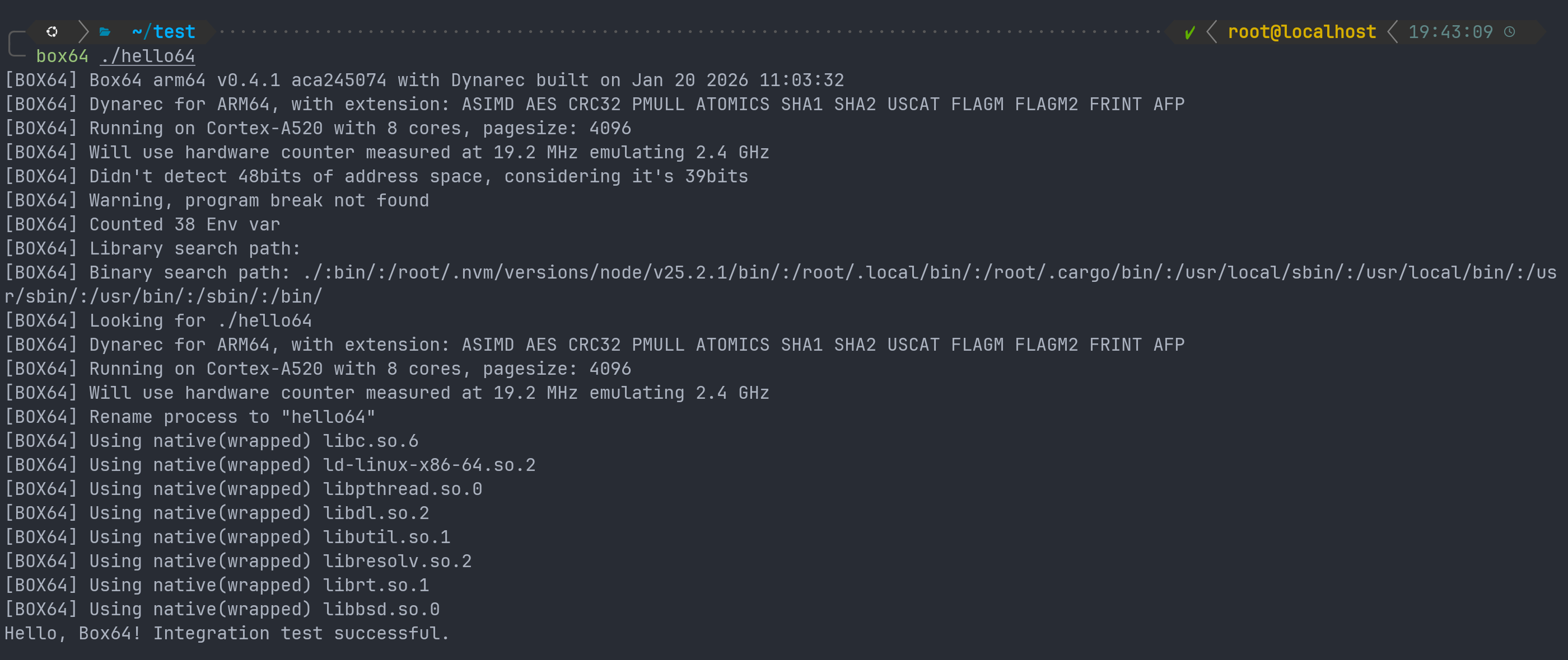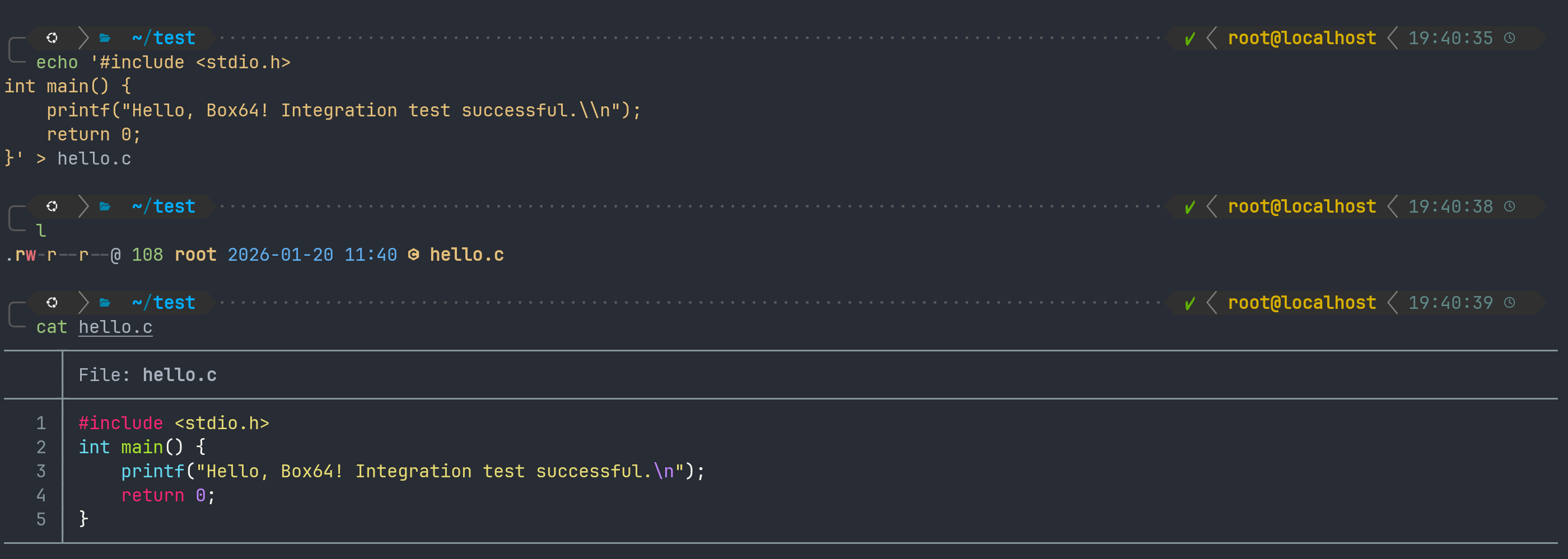 echo '#include <stdio.h> int main() { printf("Hello, Box64! Integration test successful.\\n"); return 0; }' > hello.c