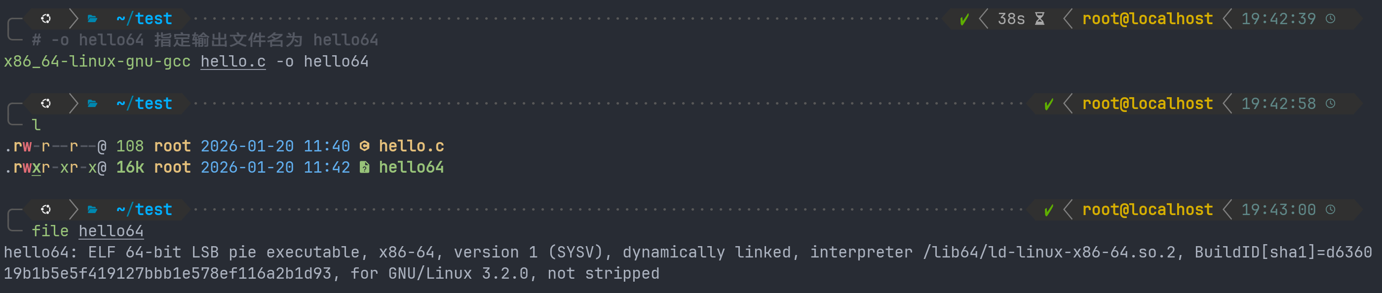 使用x86_64编译链来编译c文件,并使用file指令验证它确实是x86_64文件。