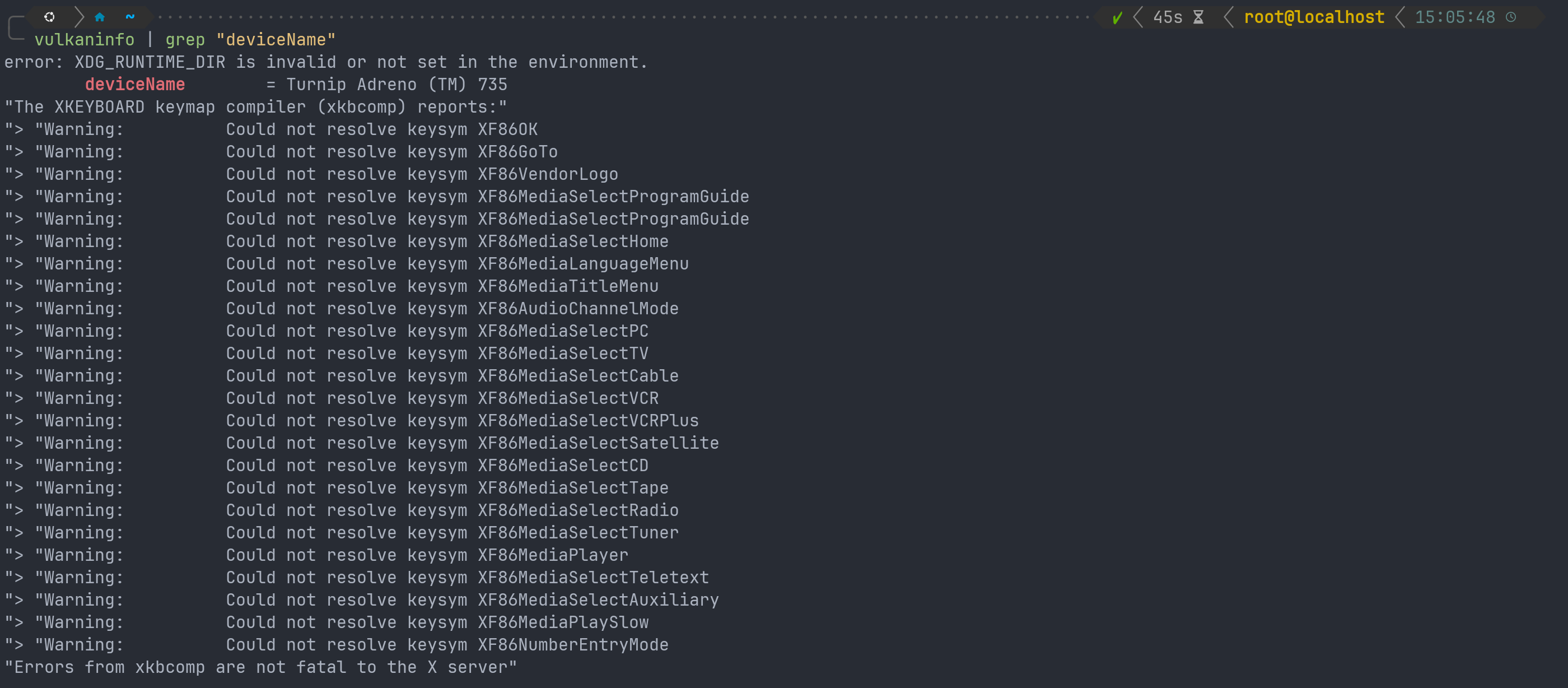 以上是我未启动桌面环境时输出的信息。其中XDG_RUNTIME_DIR是一个proot环境下没有预设的目录。虽然弹出了很多警告,但是都是无害噪音,并不会影响最终运行。