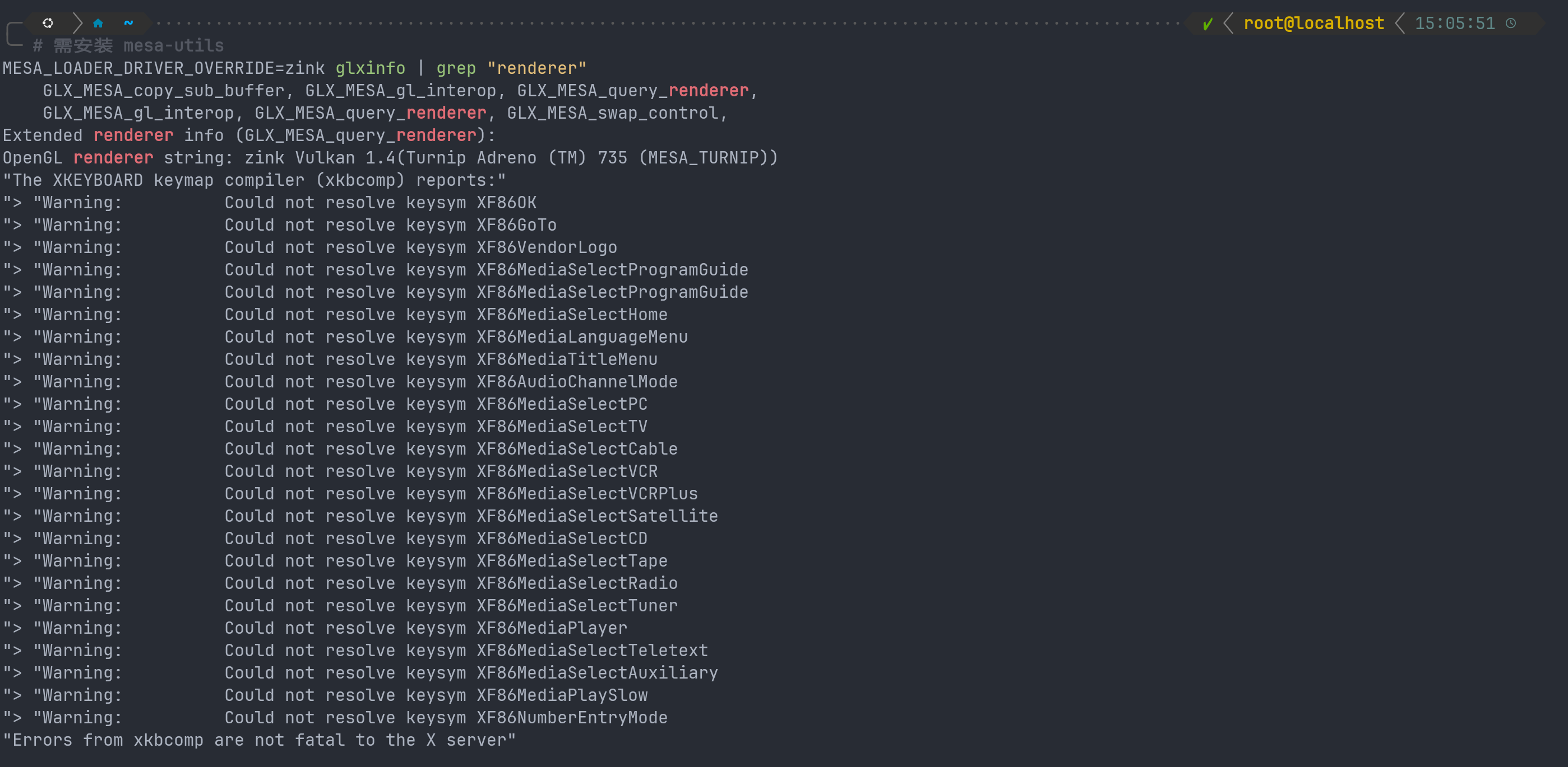 # 运行 glxinfo 看看 renderer 是否变成了 Turnip
