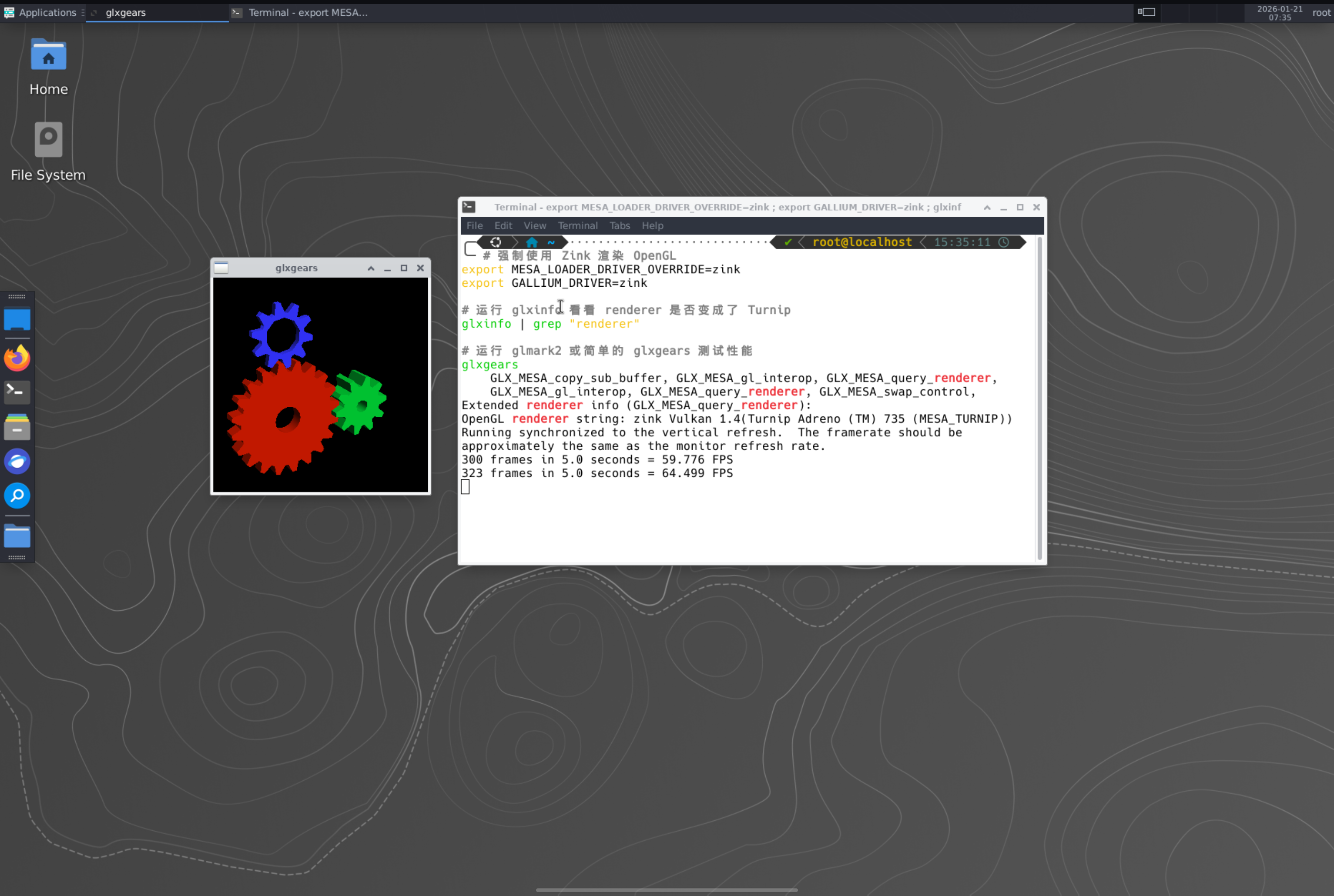同样出现了大量无害噪音。其中最关键的信息是zink Vulkan 1.4(Turnip Adreno (TM) 735 (MESA_TURNIP)),表示zink成功启动并挂载在turnip上。zink将OpenGL调用翻译为Vulkan调用,此处如果能成功显示意味着你的系统可以高效的渲染OpenGL图像。