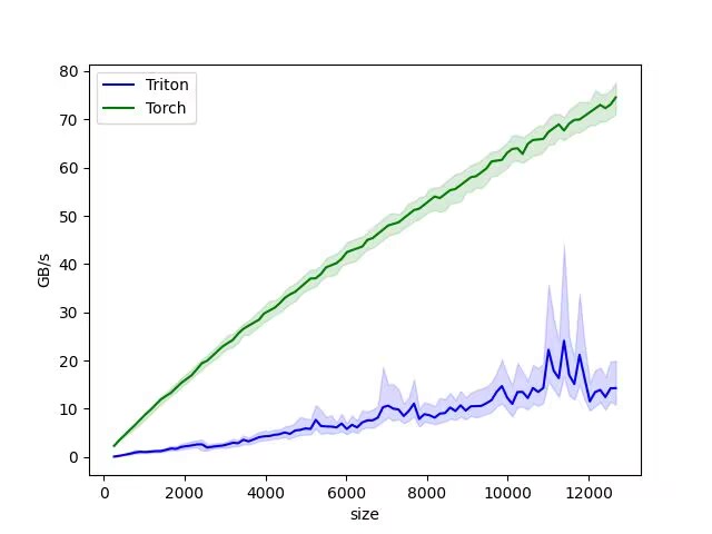 在本代码中,实际进行加法计算的用时非常少,大部分的用时都在信息搬运上,而带宽正描述的是这一行为的速率。通过运行这段代码,我们就成功得到了torch原生写法与我们自己写的triton算子之间的性能差异图表。